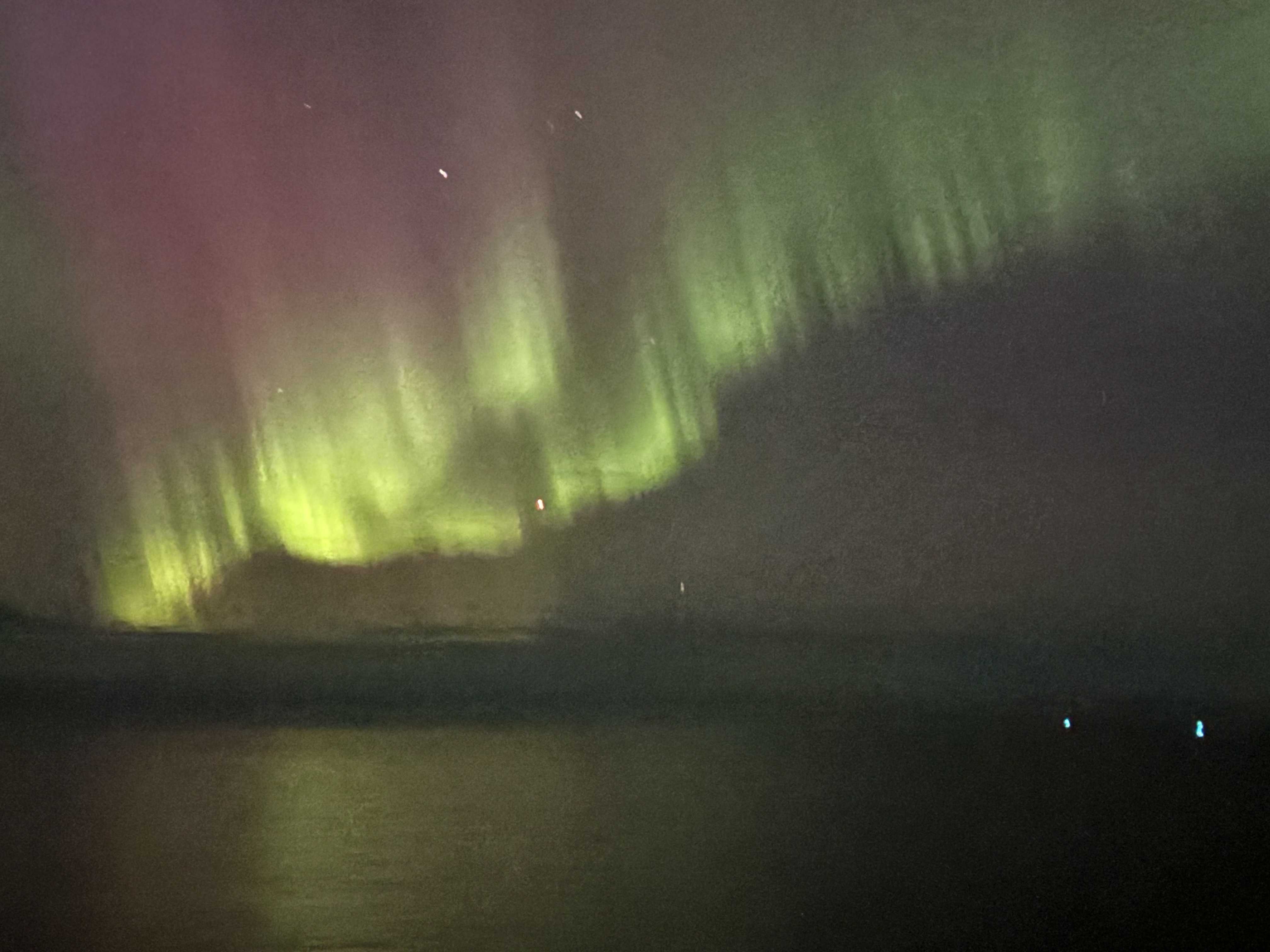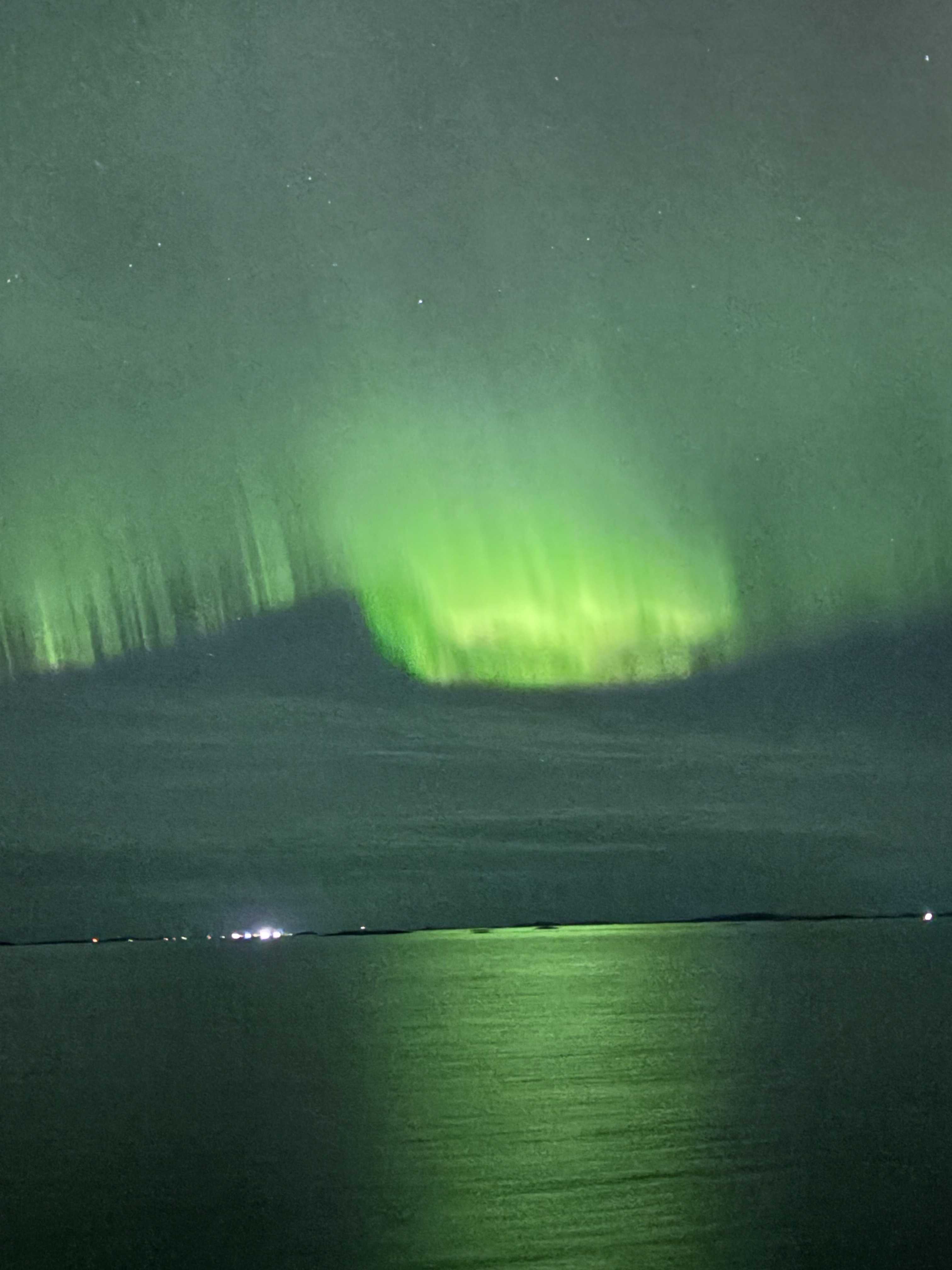強烈なグリーン色が海面に反射して、逆さオーロラに、、、