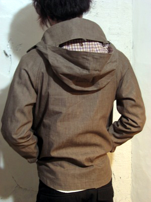 衿にフードが収納されたデザインが特徴的なブルゾン