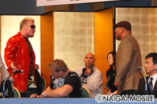 木下社長はすぐ後ろで乱闘が起きているのに、前にテーブルがあるもんで逃げ場のない状況! 危うく巻き込まれるところだったが、終始穏やかな表情だったのはさすがだ。五味選手のほうがビックリしていたくらいだ。