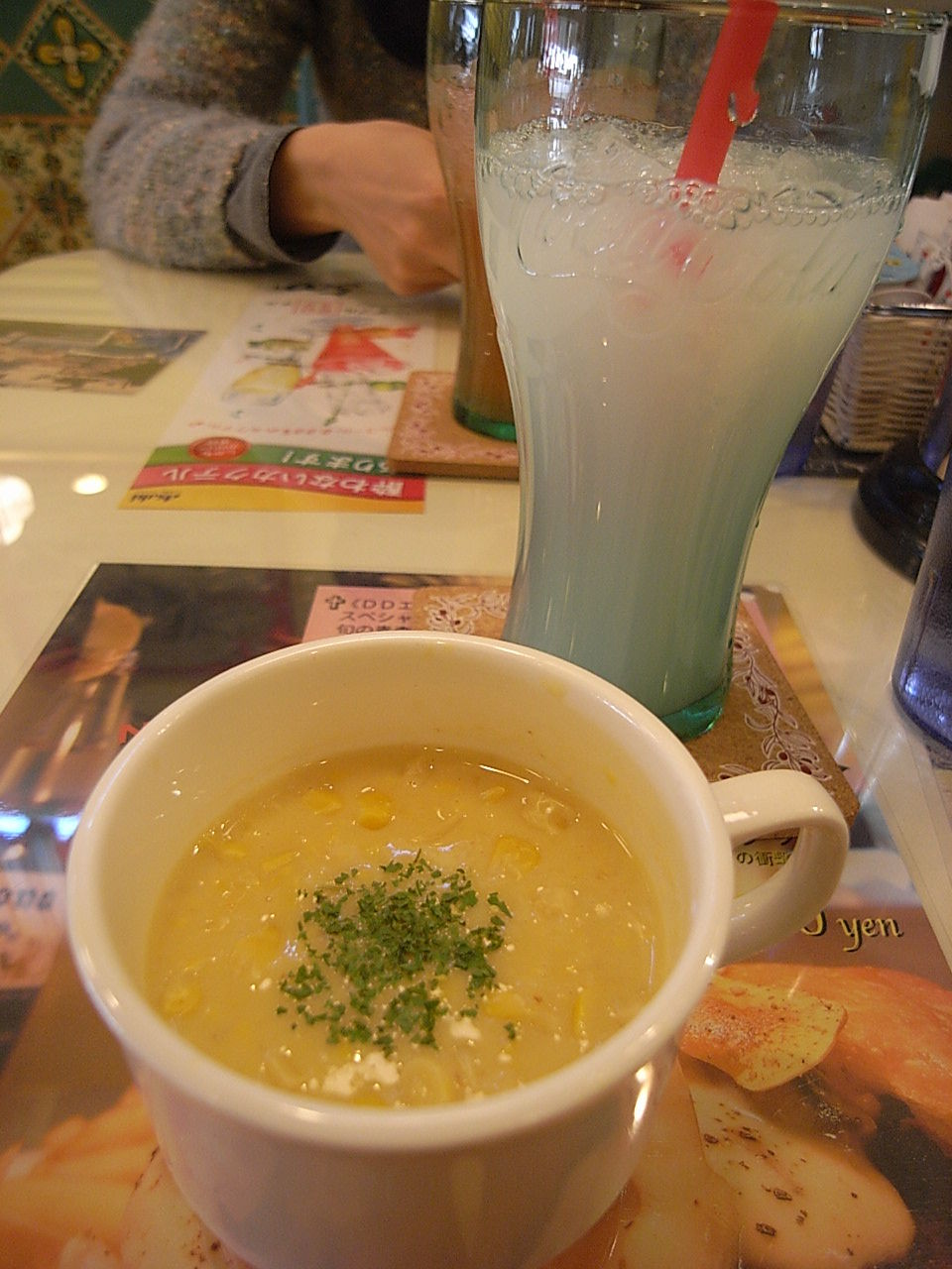 コーラ、レモネード、コーヒー、紅茶などもあります。今日のスープはつぶつぶコーンたっぷり。