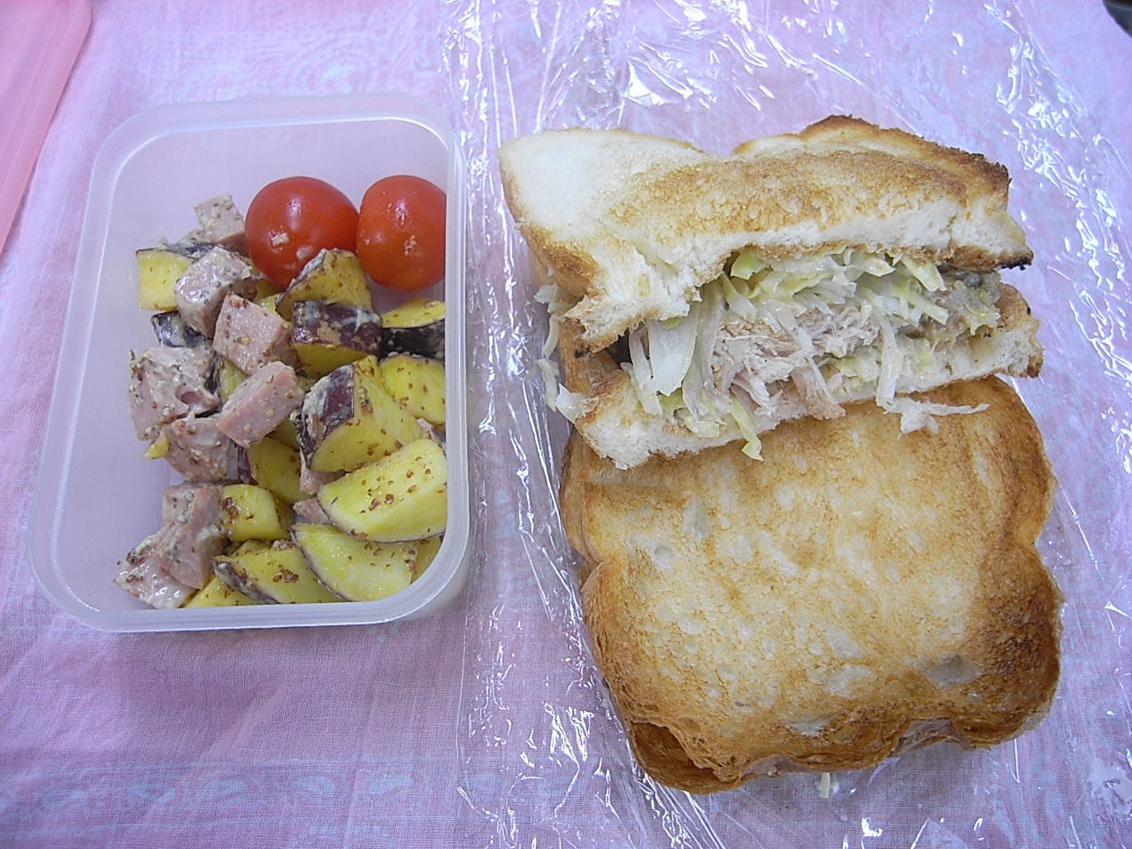 煮豚とキャベツのサンドイッチサツマイモのサラダ