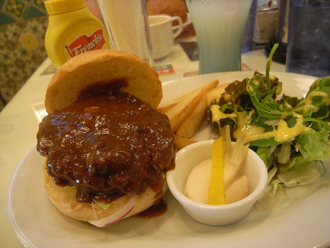 スープ、ドリンクつきで¥1000のハンバーガーランチ。ソースはデミグラス、その他が日替わり。今日はブラックペッパーソース、カリビアンソースでした。ワタシは久しぶりなので、デミに。ドリンクはカルピス。なつかし~~~~。