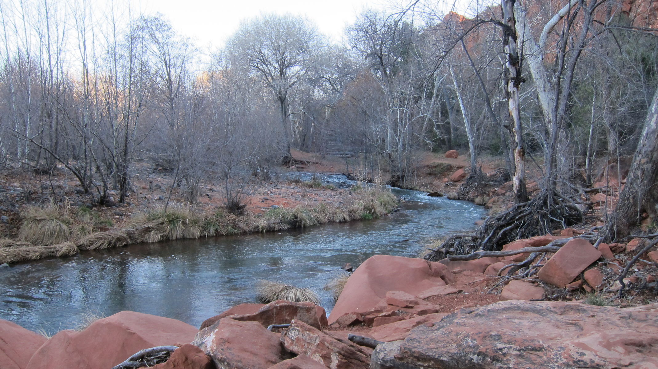 あの先にある、カセドラル、大聖堂のような岩のへ登るのです!レッドロッククロッシングという美しい公園のほとりを流れるオーククリーク沿いから歩き始めます。