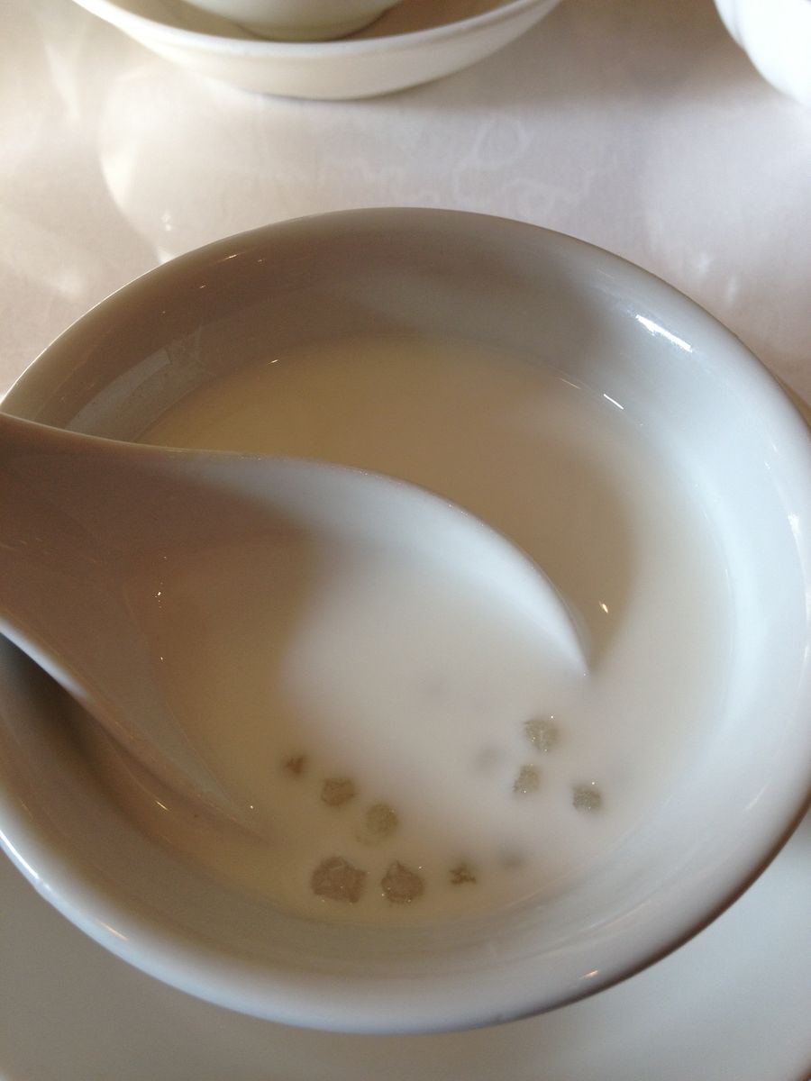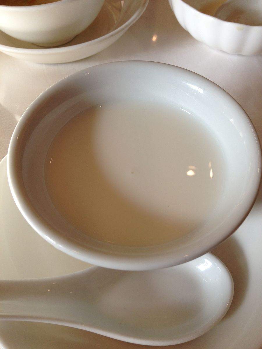 あれ!?!?いつも杏仁豆腐にフルーツソースがかかっているのに、真っ白!なんだろう、色々変化するものだな。新年からはソースなしかな。経費節減か!?などと思って食べようとしたら、あれ!固まってないぞ!この杏仁!つくりたてというか時間が足りなかったのか!と・・・・不安になったものの
