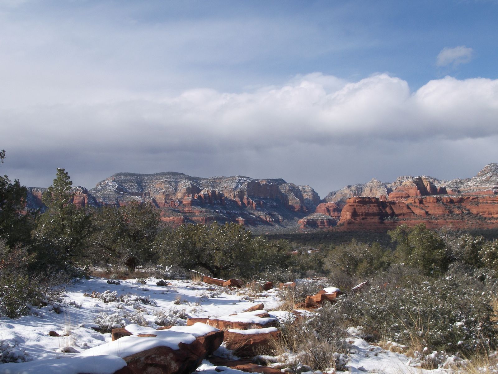 雪が降っちゃったら・・・って考えるとそうなんだけど、雪が見れるなんてラッキー☆という風に受け止めていたら旅行は本当に楽しくなると思うのです。旅にハプニングはつきもの。人生にも・・・・(笑)何か起きたらそれを楽しみましょう~~。何度か、セドナで雪を見たことがあります。それはそれは綺麗でしたよ・・・。勿論、真っ青な空に光がさんさんと注ぐ太陽も美しいけど、雲がたくさん浮かんでる空も大好き。雲があると夕焼けが楽しみになります。