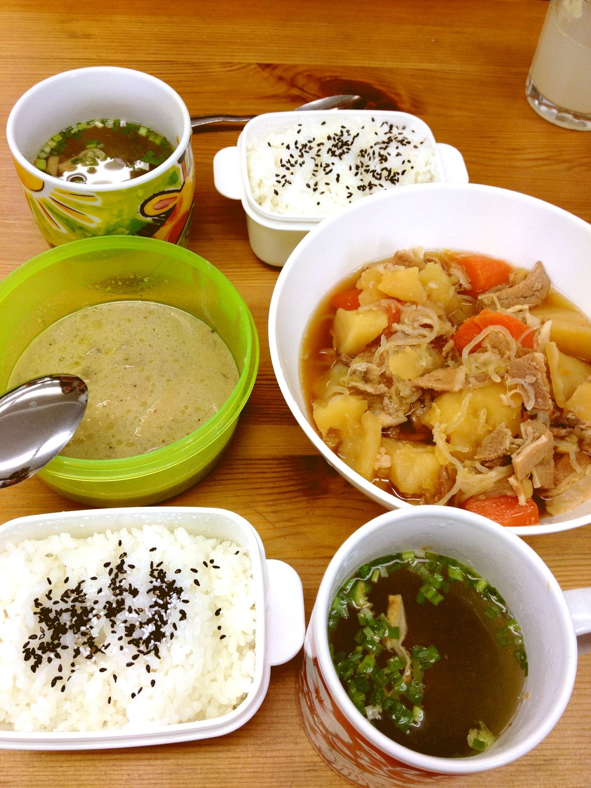 白いご飯だけはワタシが朝炊いてもってきました。あとはなんと・・・・・104で分けていただいたもの。肉じゃがとグリーンカレーです。これでいいじゃん!というかんじのご飯。