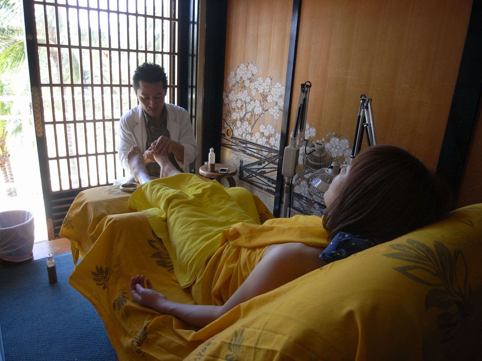 まずは、東洋医学を使ったホリスティック治療をしてくださるシモン先生にフットフィスナーという施術をしてもらいます。Juju'be フット・スイナーとは、足の裏の皮膚の内側に溜まった老廃物を取り除きながら同時に足ツボを刺激して健康を取り戻す方法です。ぎゃ!っていうくらいに痛いところがあって、先生はそれで身体の中の状態をみているのでしょう。