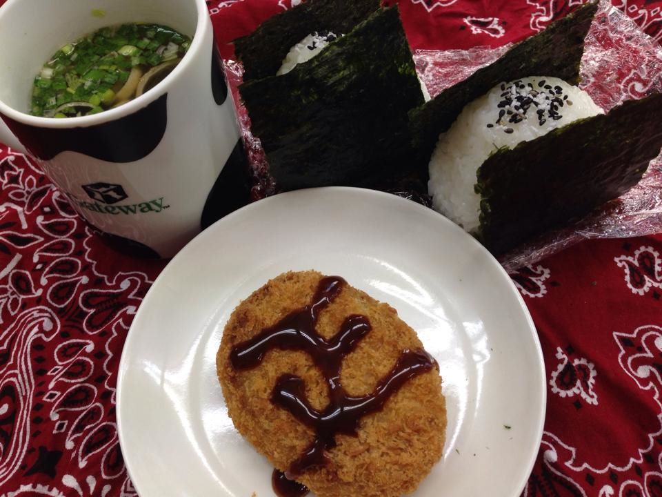 おにぎり2個+コロッケ ソース書つき「正」+お味噌汁