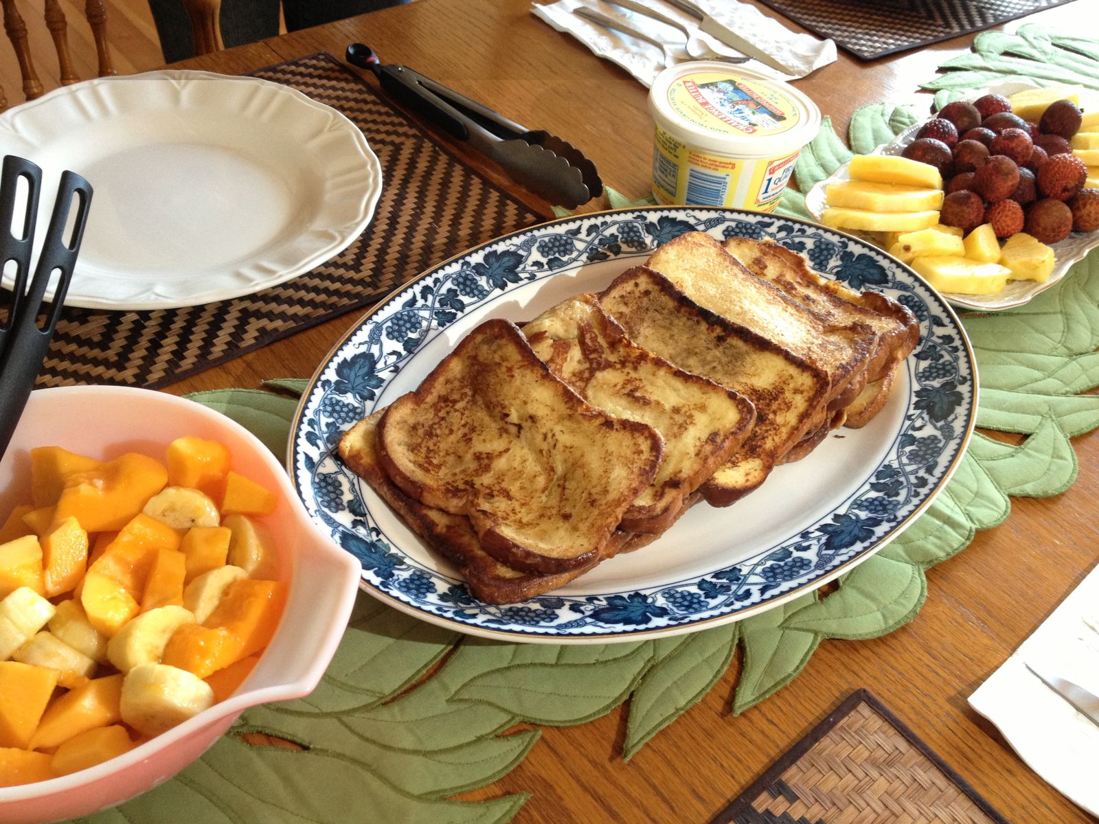 ココナッツミルクのフレンチトーストに、リリコイバター(パッションフツルーツ)そして地産のフルーツいっぱい!ほんとに信じられないくらいにトロピカルフルーツは安い!ハワイに行ったらパパイヤとかマンゴー食べ放題よ!それと、アボカドも安い~~~