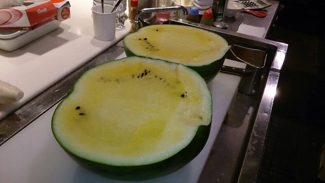 黄色いスイカー!!すごい!まっ黄色!でかい!そして、皮までとった状態でお持ちくださいました。なんと親切なお方でしょう。おすそ分けもしましたので、昨日のお客様はきっと黄色のスイカにありつけたことでしょう!