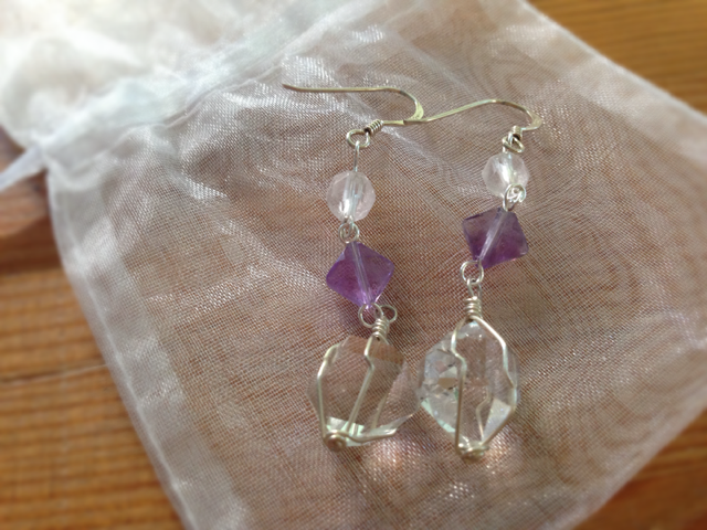 通常、インナーグロウジュエリーは、ゴールドのワイヤーを使っているのですが、今回、特にシルバーをご希望で、シルバーのワイヤーのピアスにアメジストとローズクオーツをお付けしました。