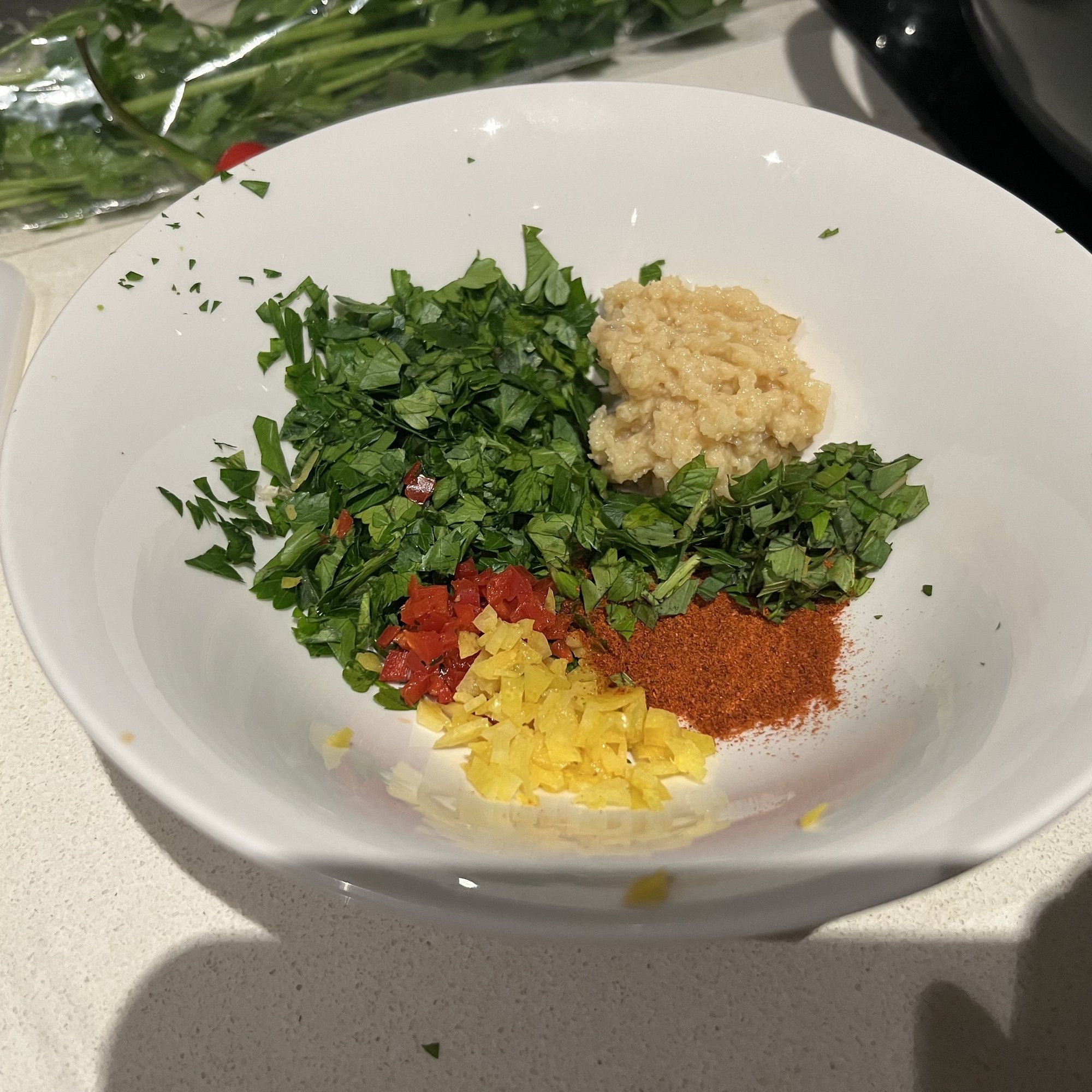 1)まずは、パセリ、ミント、レッドペッパー、レモンの皮をみじん切りにしていきます。