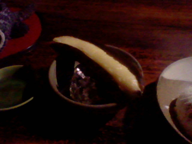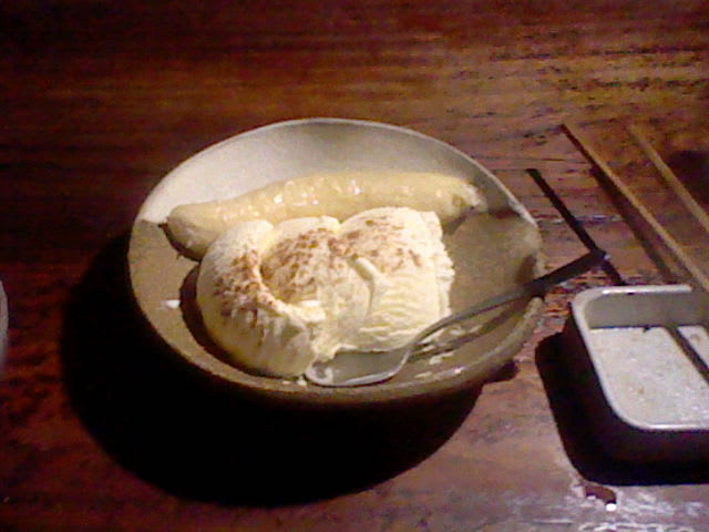 締めで”バナナアイスクリーム”というデザートを注文したら、まずバナナ1本が出てきて「皮が黒コゲになるまで焼いてください」と言われまして。
