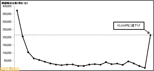 この後、またこれといったタイトルが発売されない間は減少していくでしょうが…最終的にまた、値下げ前週の売上(約4,000台)くらいまで落ちてしまうようでは、さすがに哀しいです。それまでに、どうか次の手が打てるよう精進して欲しいように思います。