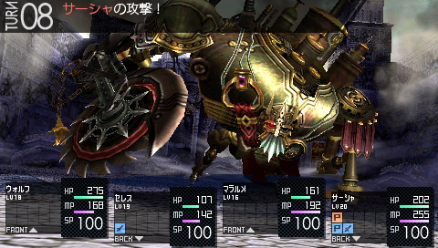 いわゆる「日本製RPG」を目指した作品ですが、敵キャラの「敵対心」をコントロールするシステムや、HP&SPが0になると完全に消滅してしまい二度と復活しなくなるシステムなど、戦闘システムに様々な特徴が見られます。