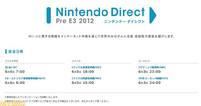 日本での「ニンテンドーダイレクト Pre E3 2012」は、6月4日(月)の午前7:00より約30分実施される予定です。