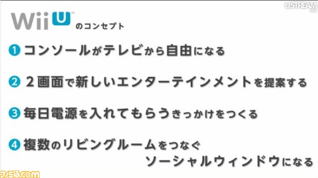 Wiiでは、ゲーム機との関係を変えることをコンセプトに掲げてきましたが、Wii Uはそれとは別に、4つの独立したコンセプトを掲げています。