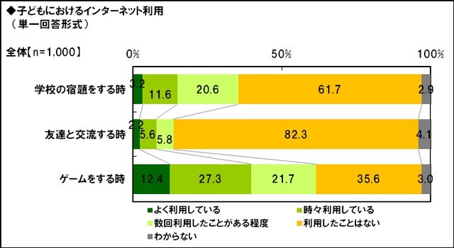 あと、個人的に気になったのは、学校の宿題をする時の利用率が約35%で、そのうち「よく利用」「時々利用」が、足して約15%程度といったところです。