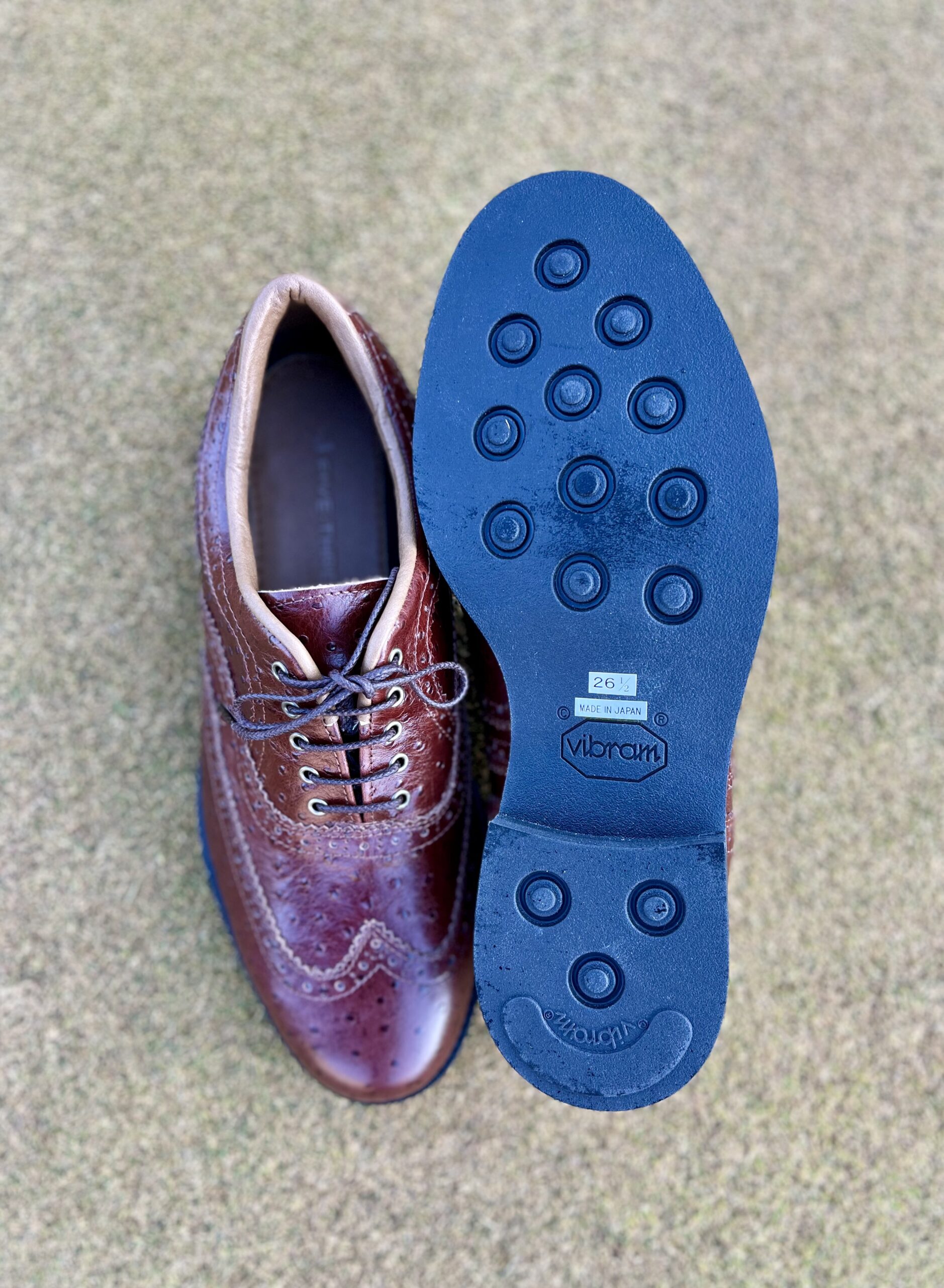 アッパーはゴルフシューズのウィングチップモデルなのですが、こちらはアウトソールをビブラムにカスタムしておりますので、なんとビジネスシューズなのでございます!