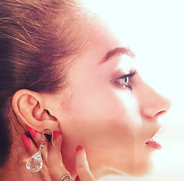 水晶ティアドロップブリオレットカット&ロードライトガーネットのスゥイングピアスです。
