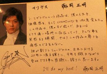 続きは本編2時ぴったりに始まり、司会は前回に引き続き軽部アナ。まずは20周年の歴史を映像で。歴代の出演者達の映像や名前が出てきたり、初演・10周年・2000回記念の時の映像や記事がバーっと出てきたりしました。藤岡クンは残念ながら名前と最後の方にチョコっと映っただけでしたけど、初演の1987年にはまだ2歳だった私にも歴史を実感できる映像でした。この映像だけでも気分は最高潮な感じなってしまいました