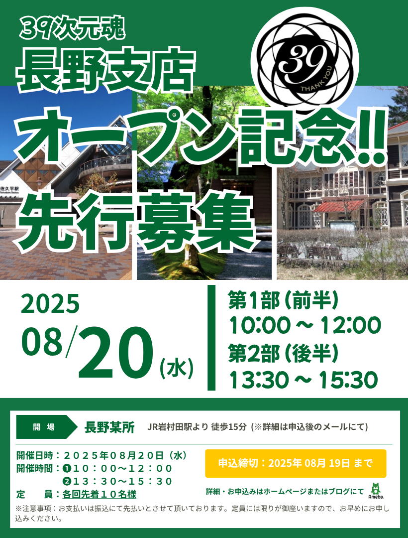 長野支店オープンセール8/20(水)長野支店がオープンします。今回 特別に、ご予約いただいた皆様には、39コーヒーを1袋(5000円)プレゼントします。物は試しです。信じきれない方も、見学にいらしてください。※施術を受けないとコーヒーはもらえません。東海支店長と、私大宮支店長も参ります。ご予約はこちら👇https://form.run/@39dimensionalsoul-naganosenkou39次元魂 長野先行募集39次元魂 長野支店 オープン記念!先行募集! 毛細血管診断・破壊 8/20(水)こちらは39次元魂 毛細血管診断・破壊 長野支店 先行募集専用のお申込みフォームとなります。■日時:2025年8月20日(水)■会場:長野県佐久市(※詳細は申込後のメールに記載)■施術料金:1人 40,590円(税込)form.run