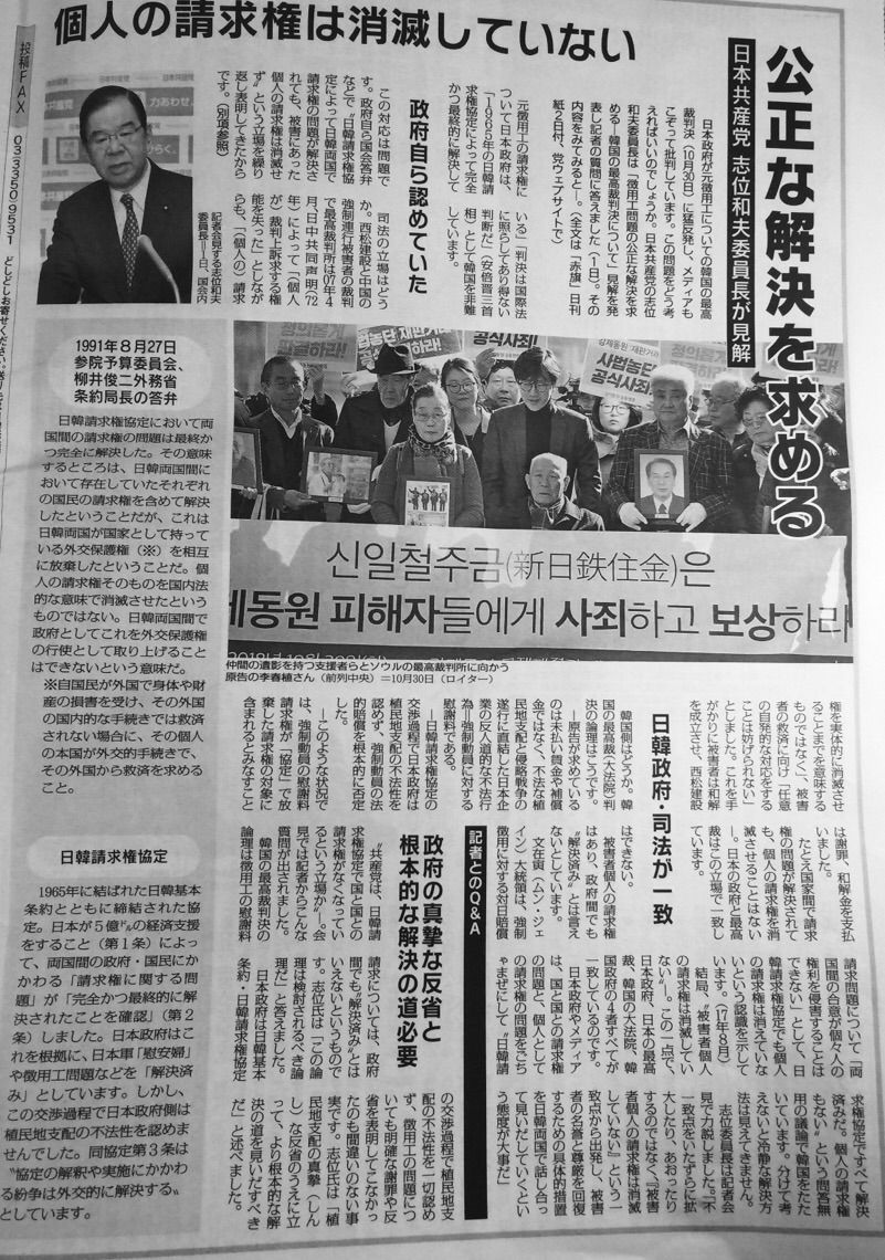 穀田氏は、「個人の請求権は消滅していない」と強調。「日韓双方が被害者の尊厳と名誉を回復するという立場で冷静で真剣な話し合いをすることがきわめて大切だ」と求めました。