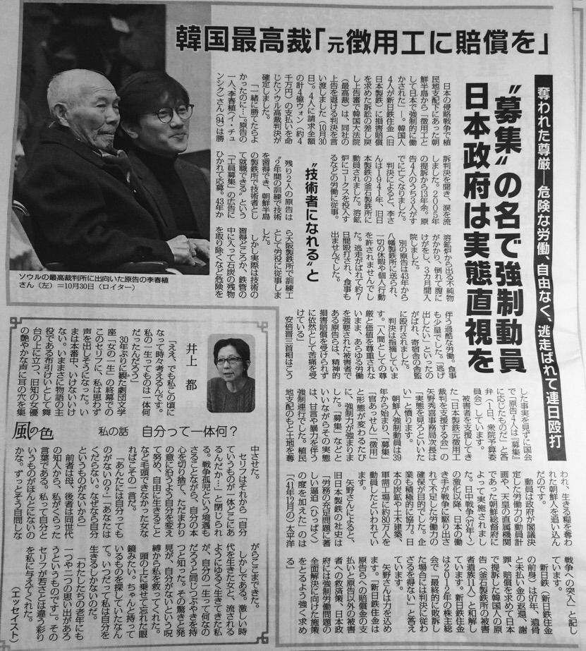 日本がアジア・太平洋地域を侵略した太平洋戦争中に、日本で強制的に働かされた韓国人の元徴用工4人に、韓国の最高裁判所が新日鉄住金に損害賠償を命じた判決(10月30日)について5日、日本国内の弁護士有志が声明を発表しました。