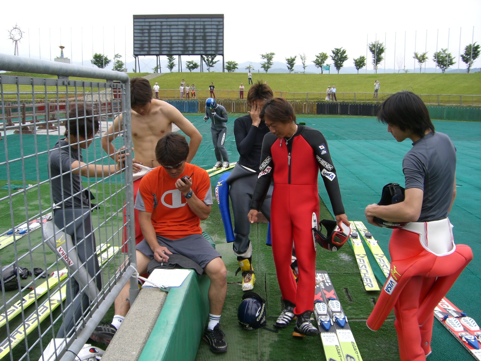 トレーニング中の岡部孝信選手。後に見えるのは原田雅彦コーチ。