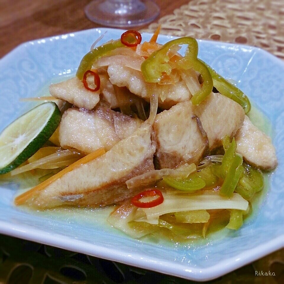 お刺身を切り 塩 米粉をまぶし フライパンで焼く