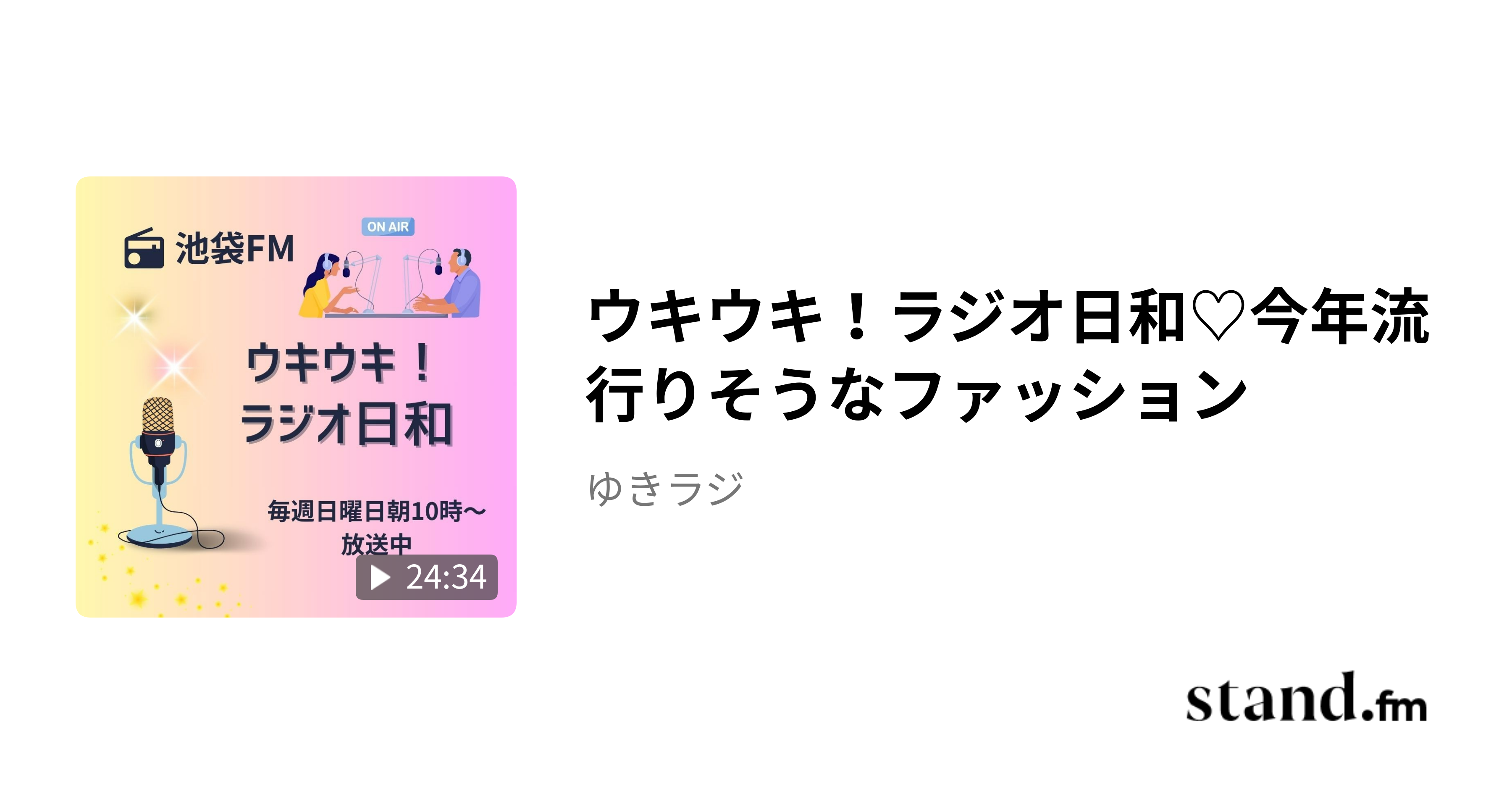 ウキウキ!ラジオ日和♡今年流行りそうなファッション - ゆきラジ | stand.fm🎙️🌈 池袋FM《ウキウキ!ラジオ日和♡》 \毎週日曜あさ10時〜 生放送!/ ✨池袋FM公式YouTubeが開設されました!✨ しかも今、再生回数がじわじわ急上昇中📈 「気づいたら最後まで聴いちゃった」 「朝から元気もらえた!」 そんな声が増えています💓 この番組は、 あなたの週末を ☀️ちょっと楽しく …stand.fm