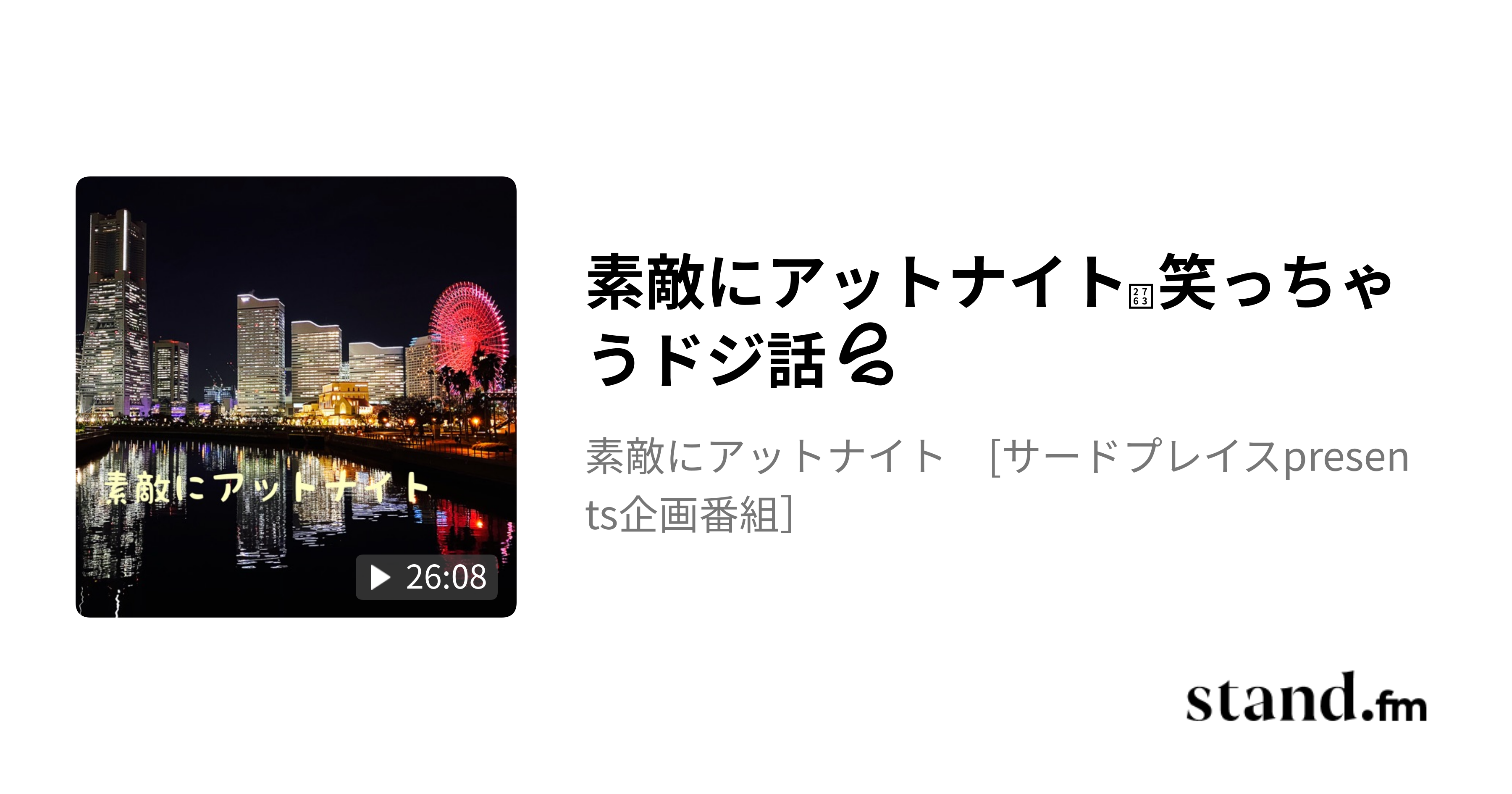 素敵にアットナイト素敵にアットナイト❣️笑っちゃうドジ話💦 - 素敵にアットナイト [サードプレイスpresents企画番組] | stand.fm素敵にアットナイト 笑っちゃうドジ話 金曜日の夜9時。 一週間の終わりに、ちょっと肩の力を抜いて、思わず「ぷっ」と笑ってしまう時間をお届けします。 今夜の『素敵にアットナイト』のテーマは―― 「笑っちゃうドジ話」。 完璧じゃないからこそ愛おしい。 うまくいかなかったからこそ、今では語れる。 そんな“人生の小さなつまずき…stand.fm