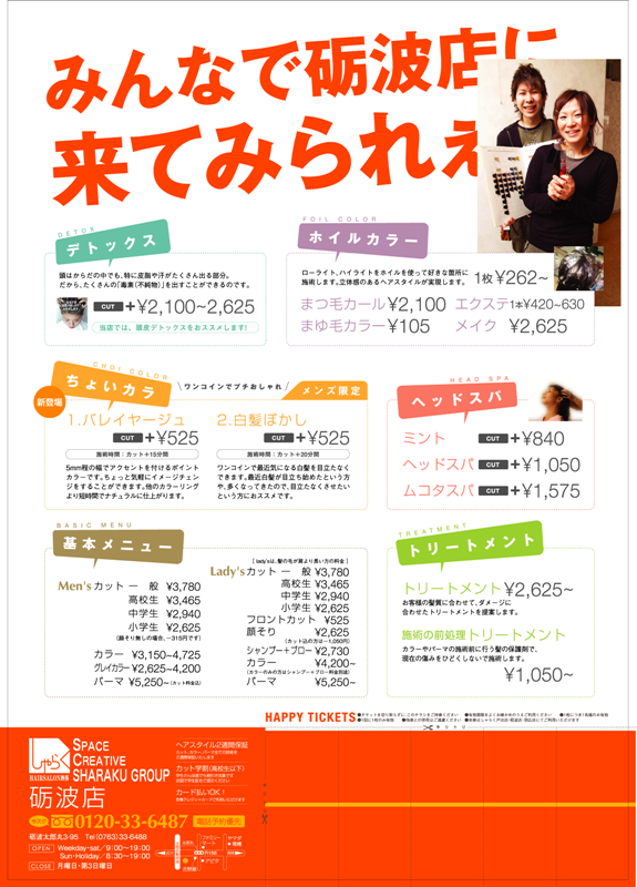 こんにちは、人事責任者の冨田欣成ですこの採用ブログを訪れていただき、ありがとうございます。■■管理者の自己紹介【経歴】成蹊大学・経営工学科(現在、経営・情報工学科)卒業後大手経営コンサルタント・企画営業、経営コンサルタント会社を経て2004年3月より、富山県NO1美容室「しゃらくグループ」のエリアマネジャー(役割はコンサルタント)経営コンサルタント時代より、成功率80%以上の実績を誇るしゃらくグループの仲間になりませんか?~普通の美容室に飽きた人、この指とまれ!!~■しゃらくでは「お客様にヘアを通じて、生活がより楽しく、より美しく、より輝いてほしい!」と強く思う方を募集しております。”お客様にヘアを通じて、ウキウキ・ワクワクしてほしい”と一生懸命頑張れば「今回冨田さんにして頂いて、最高によかったです。ありがとう。」といっていただくことがよく見られます。そんな時、本当にこの仕事をしてよかったと思います。そんな体験をしてみたいという方、ぜひお待ちしております。またお仕事だけではなく、働くスタッフを通じて様々な経験をたくさんしてほしいと思います。仕事やレッスンだけでなく、バーベキュー、花火、食事会、そしてプライベートで一緒に遊び行ったりしています。新しい仲間があなたとの出会いをお待ちしています!あなたとお仕事できるのを楽しみに待っています。しゃらくグループ 採用担当 冨田欣成 -----------------☆採用のお問い合わせは ↓今すぐ↓ 0120-76-9788 アクティ内・人事担当の冨田までメールはこちら ■お名前■電話番号■メールアドレス を明記下さい!-----------------■■しゃらくグループって何?■技術のこだわり1・2007年08月28日アクティ日記より秋冬スタイル今日は午前中、秋冬のオススメスタイルの講習会がありましたo(^-^)o事前に9人のスタイリストと2ヶ月前から打ち合わせをして、カット、パーマ、カラーの提案をしました。今回は、カラーの提案を重視して、カラーの楽しさをスタッフの方達に伝えたい(^O^)/と思い、テンションアゲアゲ(^-^)ノでやっちゃいましたo(^-^)oが、周りかなり引き気味な中(;_;)頑張っちゃいました。しかし、(;_;)やっぱり人に伝えるって難しいですね…!!これからは、更に進化した形でやっていこうと、決意した1日でした。