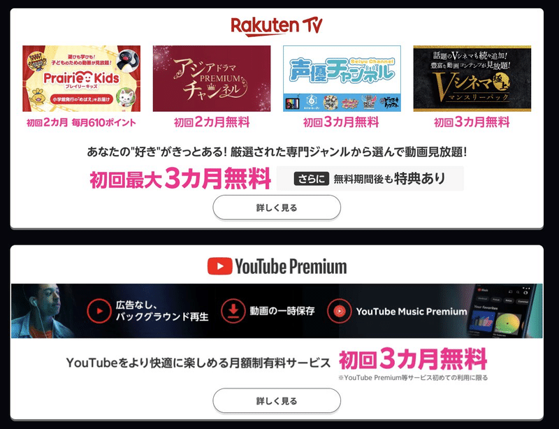 映画やドラマが好きな方には、Rakuten TVが初回最大3ヶ月無料で提供されます。最新の映画や人気のドラマを楽しむことができます。