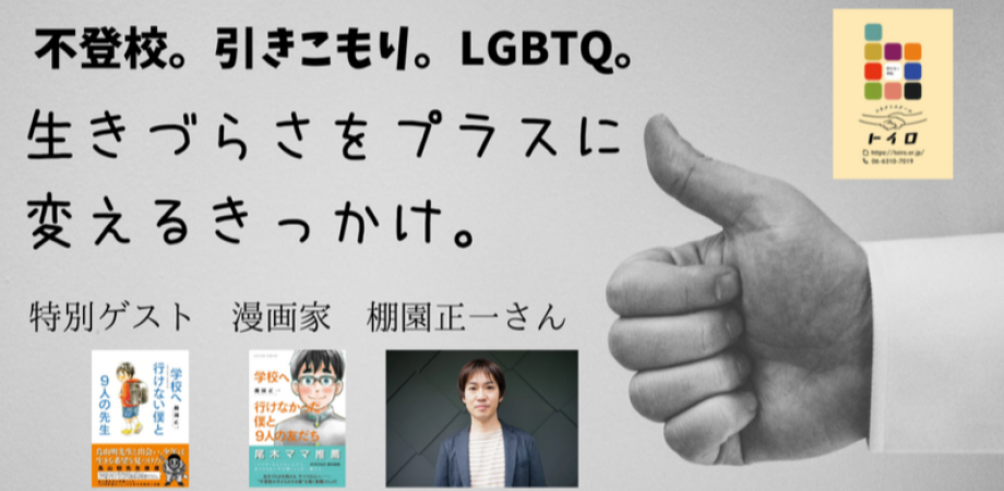 自身の不登校経験の自叙伝的漫画、『学校へ行けなかった僕と9人の先生』『学校へ行けなかった僕と9人の友だち』を描いた、棚園正一先生を特別ゲストとしてお迎えし、「不登校・引きこもり・難病・LGBTQ」の当事者の経験を、スピーカーたちがリアルにお話します。