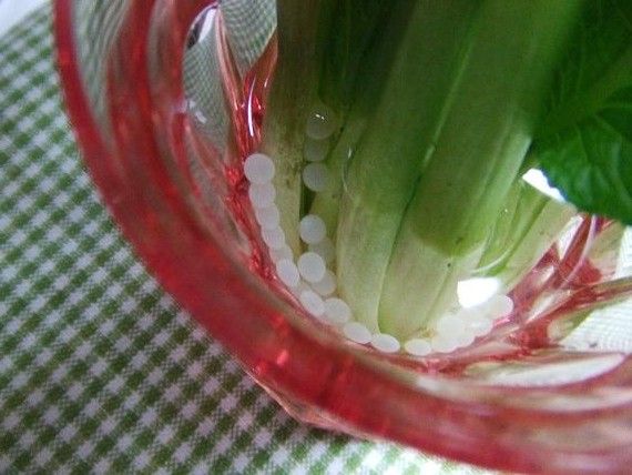ケースの隅には、ピンクのコップに小松菜をさして入れてありますが、
