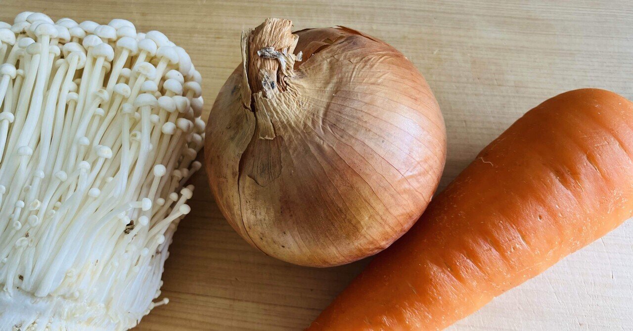 私はいつも「えのき、玉ねぎ、にんじん」で作ります。