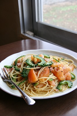 ゴーヤとトマトのパスタと黒糖アイス