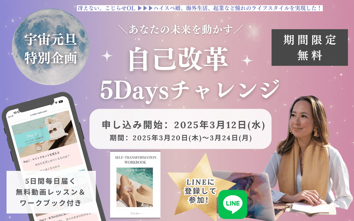 自分の魅力と強みを最大限に発揮できるようになり、理想を叶える自分に変革する為の、5日間の無料の動画レッスンです🥰