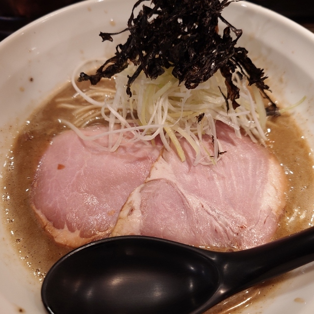 魚粉に刻んだ玉ねぎ、レッドスプラウト、バラ海苔に角切りチャーシュー。