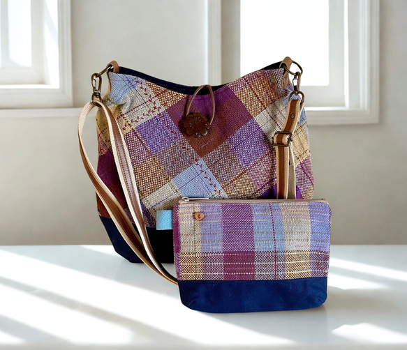 <パープルチェックのショルダーバッグとお揃いポーチ>