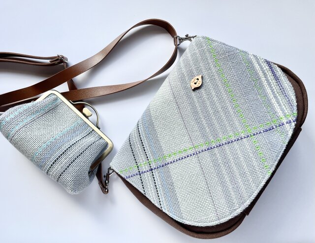 この織フラップは ブルーグレーの織色に 明るいグリーンのミシン刺繍をしました。とても落ちついた織色です。