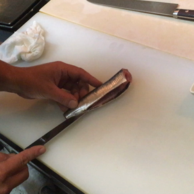 人気メニュー『ごまキュウリ』の蛇腹切り
