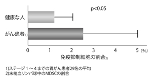 胃がんの患者さんのほうが、明らかに免疫抑制細胞が増えていました(図1)。