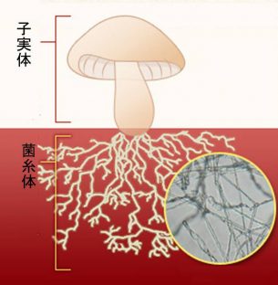 シイタケは、子実体(普段、食べているシイタケの部分)と、菌糸体(子実体の根っこの部分)で
