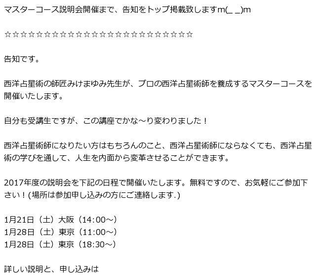 1/11(水)に木星が天秤座22度に移動しますこちらをご覧下さい。 ☆☆☆☆☆☆☆☆☆☆☆☆☆☆☆☆☆☆☆☆☆☆☆☆ ☆☆☆☆☆ 昨日は、セッション日でした。 そして、自分にとって忘れられない日となりました。 なーんと、先生の事務所でセッションをしてきました! 数年前、初めてみけ先生にお会いして、鑑定を受けた場所。 西洋占星術を、この先生から習おうと決めた場所です。 そのときは、その場所で 自分が鑑定しているなんて、これっぽっちも想像できませんでした(^^;。 そんな記念の日にいらっしゃったお客様から、ブログで感想