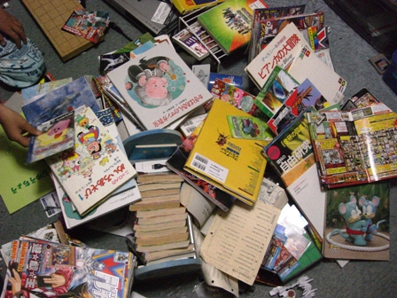 模様替え開始! 息子が行動を起こしました。 部屋の模様替えです。とりあえず不要なものを放り出せってことで、 懐かしいもの、訳のわからんもんから、失くしたと思ってたもんまで…etc ただ今、本の整理中のようです。 大好きなお話は、将来の孫に読んであげる機会があるかもしれないからなんてことで、山の中から抜き取っておきました。