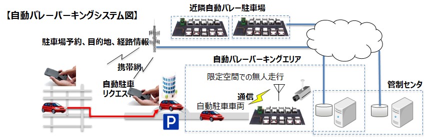 今回実施する自動バレーパーキングのシステムは、下図に示す通り「車両」、「管制センタ」、「駐車場インフラ」の3者がお互いに連動し