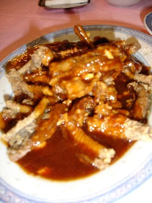 個menu呢真係見到蔡瀾餐, 不過係中午先有,而其他好多菜十之其九都無寫價錢, 即係無得叫咁解, 咁我爸媽有少少鼓譟, 我就猛叫佢地問人啦, 因為聽聞果d招牌菜個menu都無寫咁滯, 一問張生, 果然就有啦~~~於是叫了冷盤素鵝拼海哲, 蔥爆羊肉, 炒豆苗 (中), 龍井蝦仁, 東坡肉, 鱔背, 蟹粉豆腐, 我爸都知我嚵咀, 後尾加多隻大閘蟹, 但得我同我媽食, 張生拎隻蟹畀我地睇時, 我大鄉里地以為食得, 作勢叫佢剪, 畀佢話都未煮未得呀...幾瘀呀~~~我估佢入左廚房實偷笑~