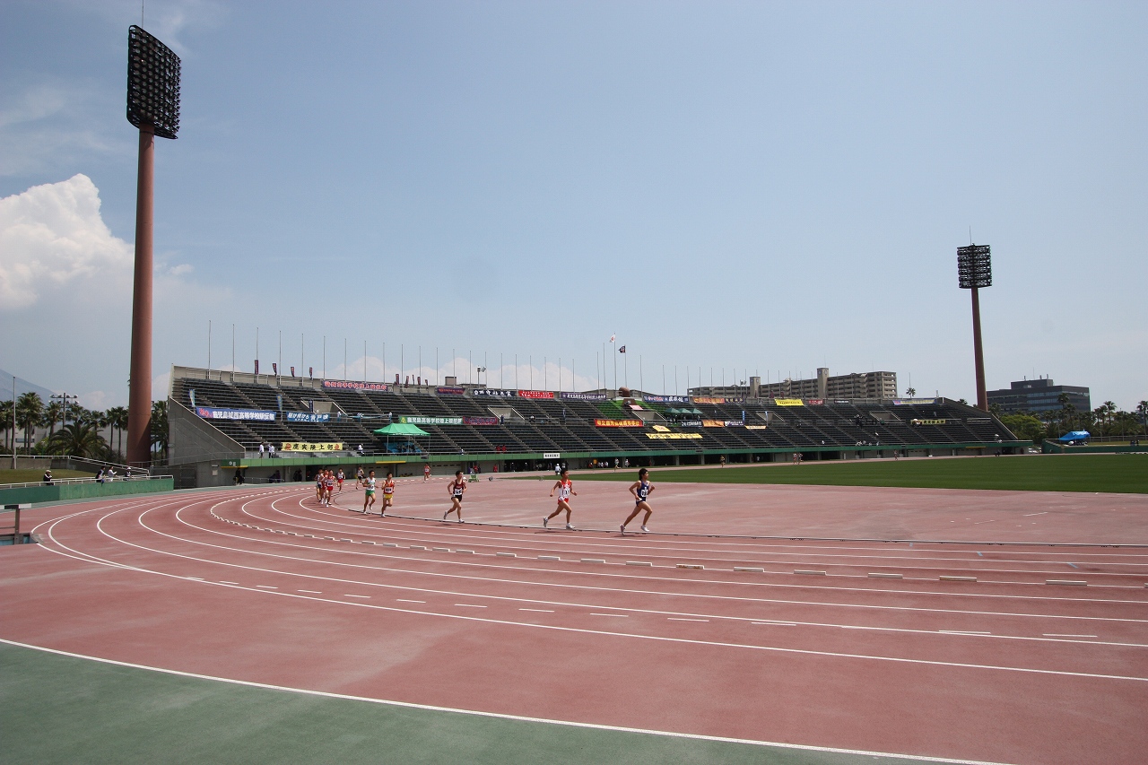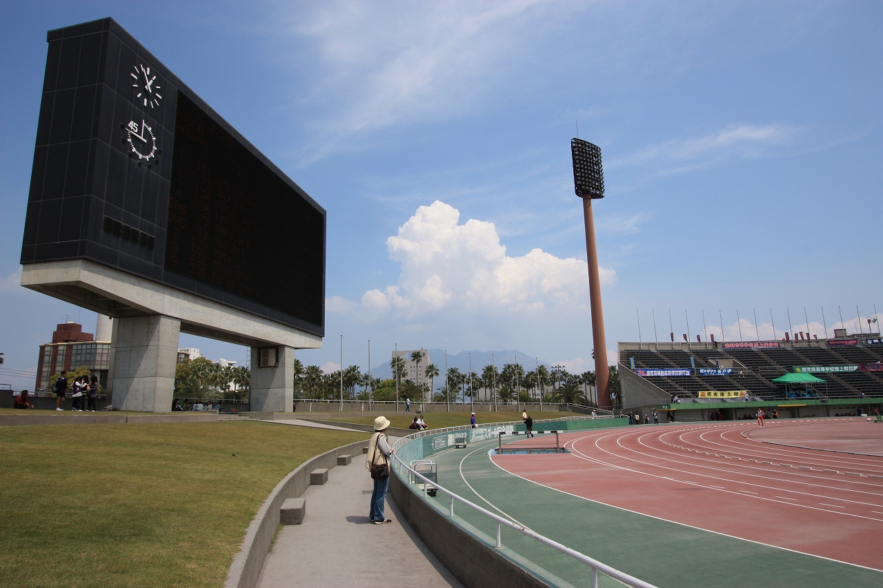 火山灰が舞い上がる鴨池の陸上競技場に着いたのはスタートギリギリ。